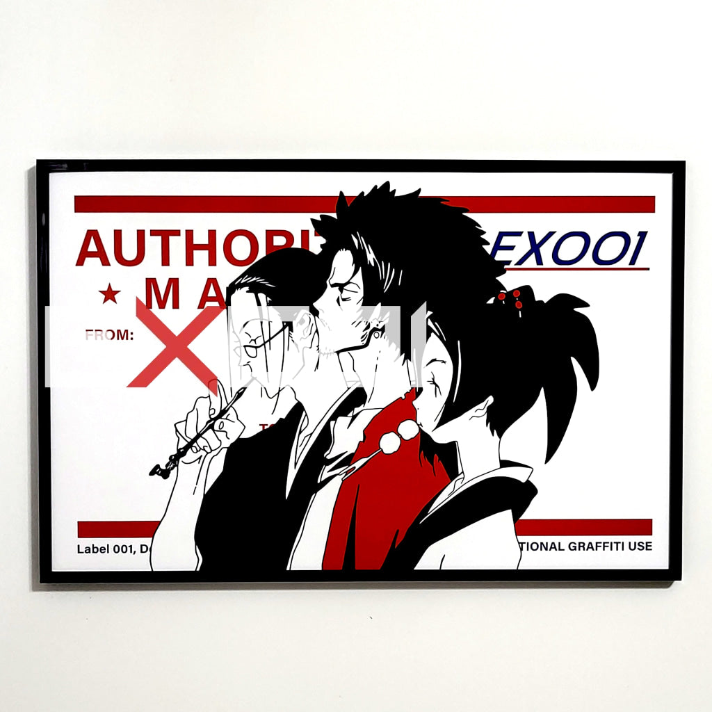 The Outlaw, the Ronin and the Girl is a hand-painted original artwork blending graffiti art aesthetics with anime-inspired storytelling. Drawing influence from late-night anime of the early 2000s, the piece captures a tense, cinematic encounter between two samurai and a young girl searching for her father.